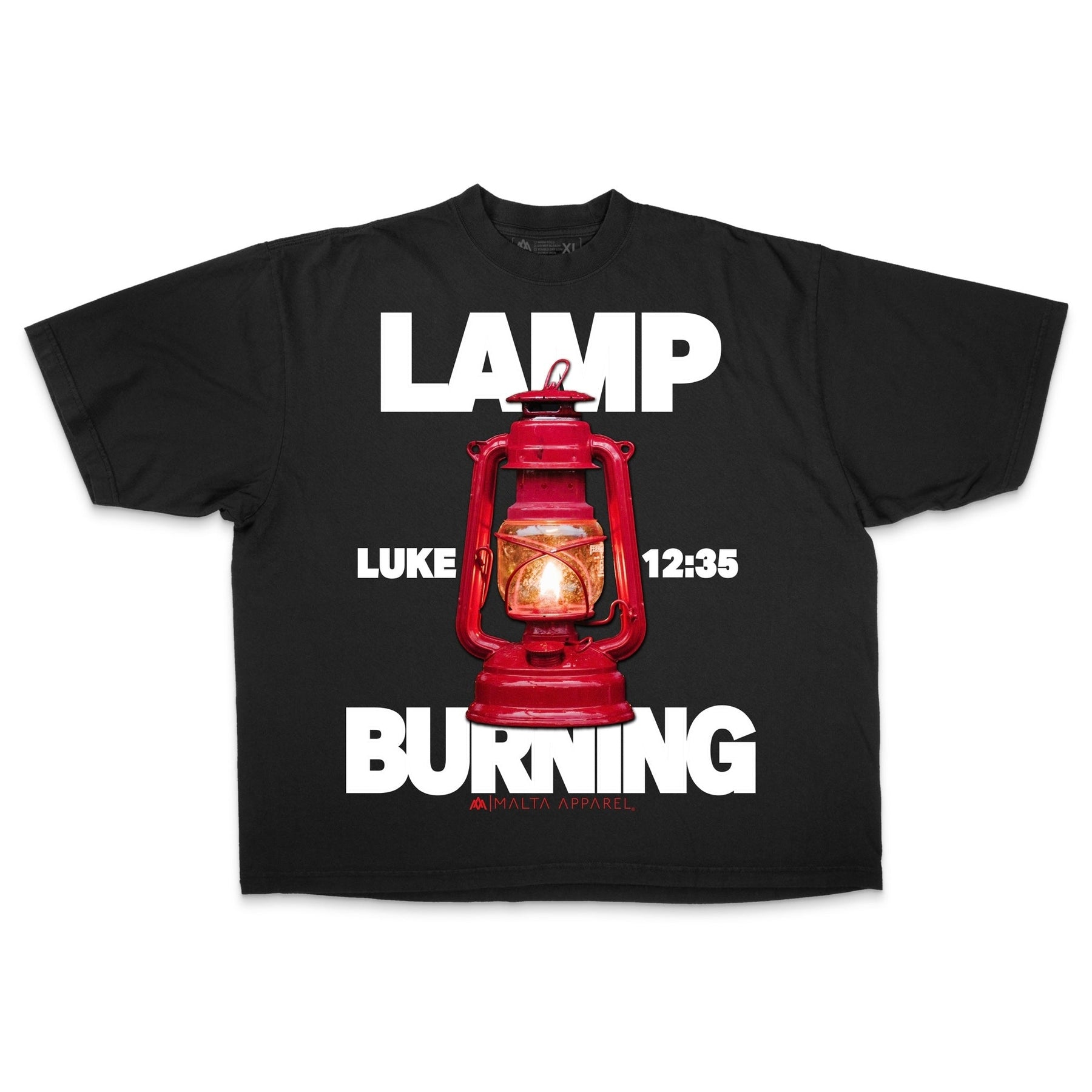 Front: Bold "LAMP BURNING" text with a red kerosene lamp, with Luke 12:35 noted as the shirt's reference verse.