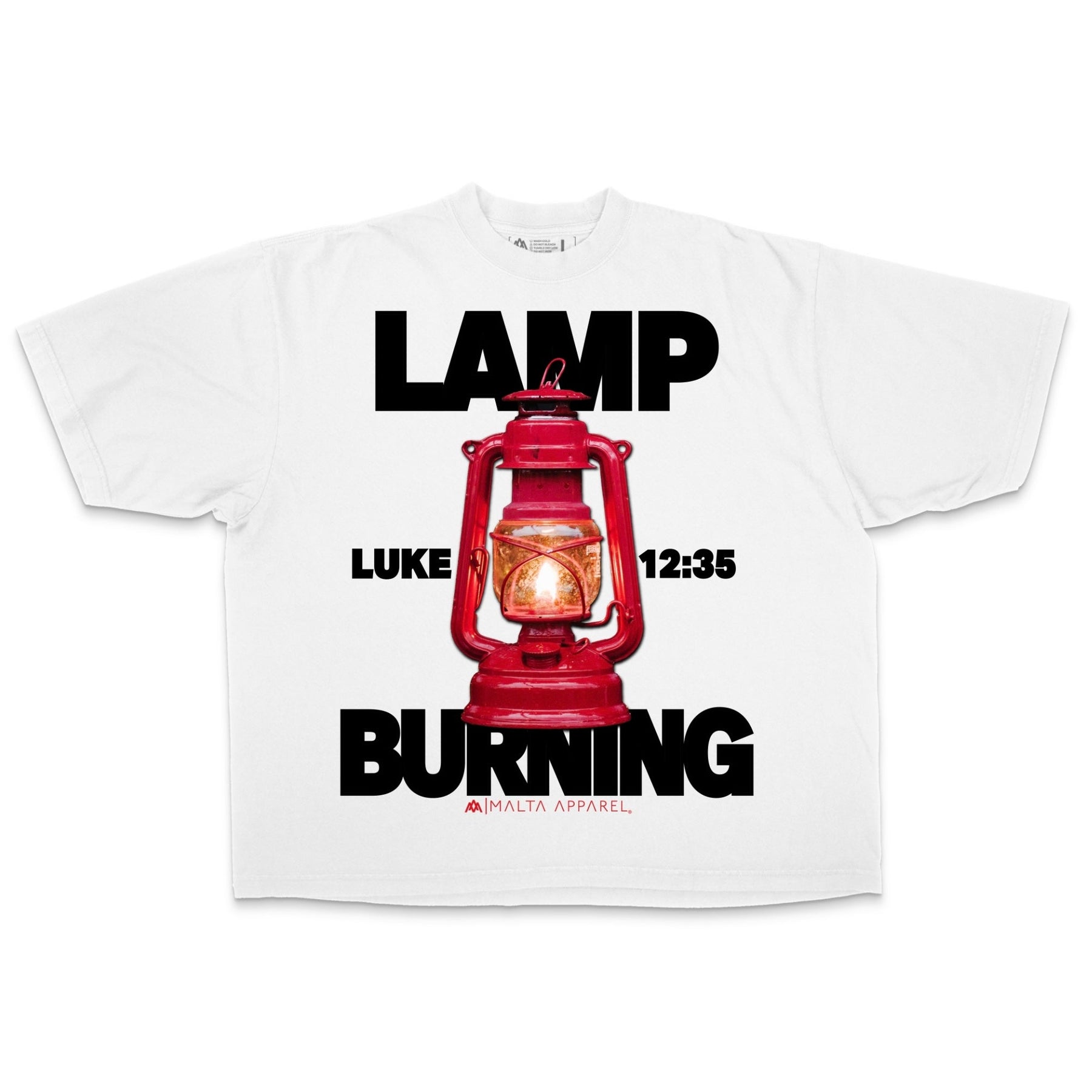 Front: Bold "LAMP BURNING" text with a red kerosene lamp, with Luke 12:35 noted as the shirt's reference verse.