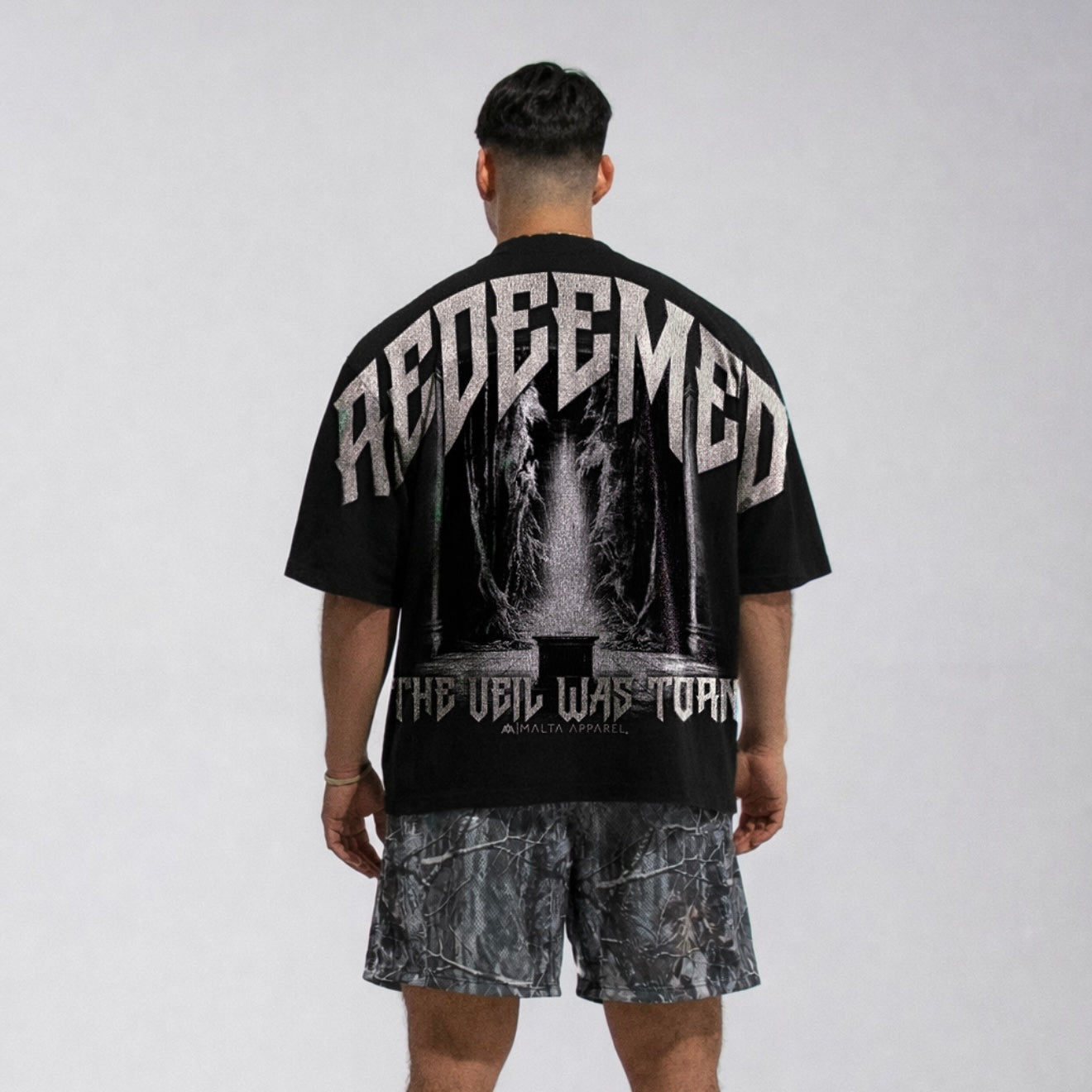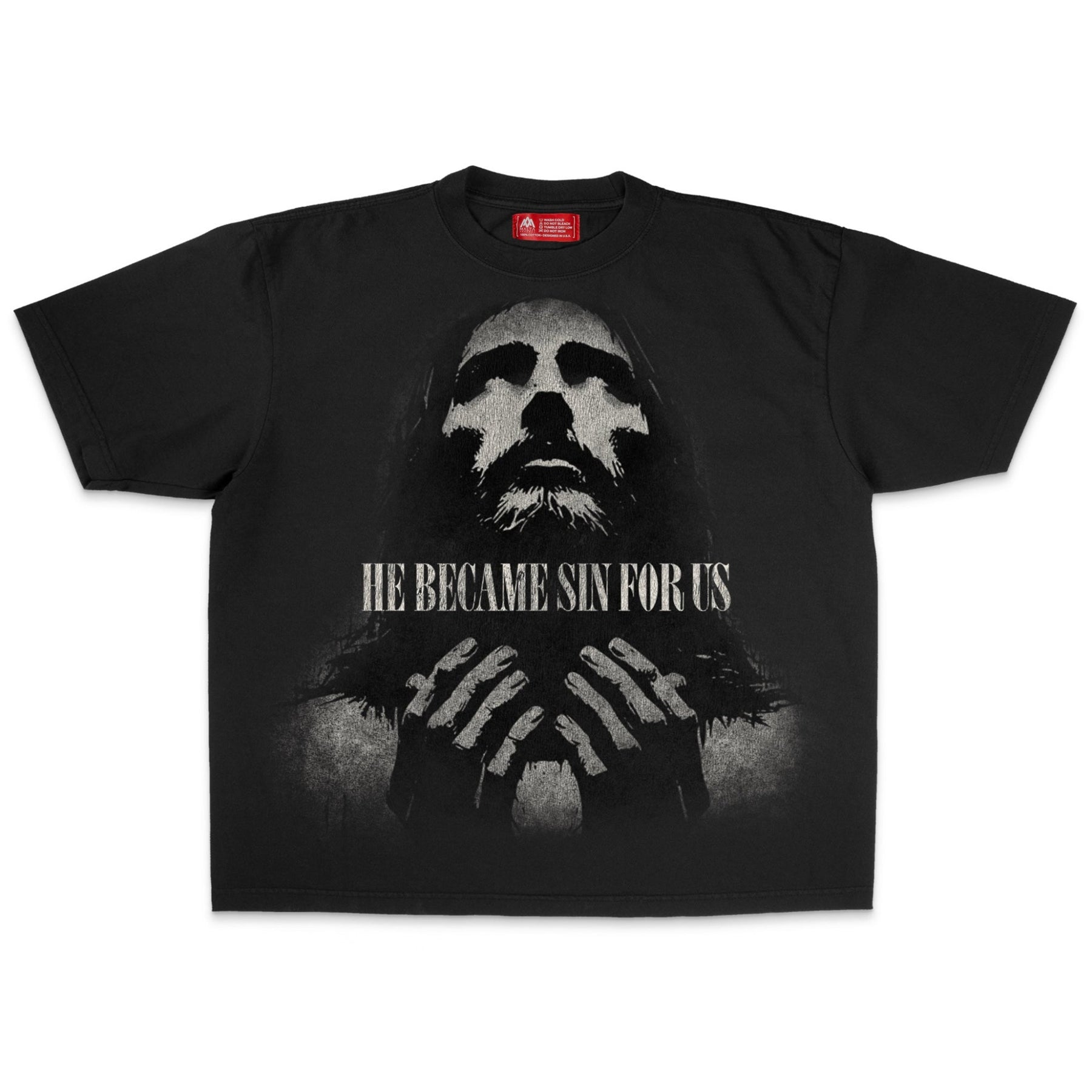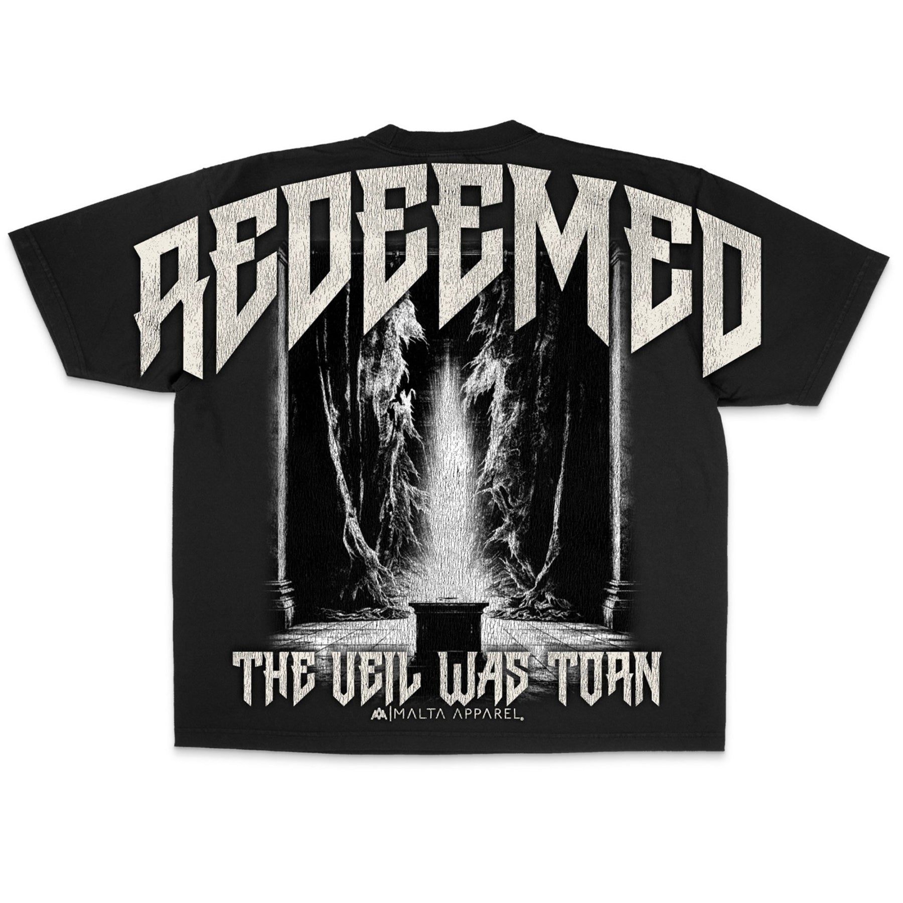 This shirt's intention is to remind us of the magnitude of what Jesus did on the cross. He BECAME SIN for us (2 Corinthians 5:21), in order to bear the ultimate punishment that we deserve. But in the moment He did this and breathed His last breath on the cross, the veil separating the Holy Place and the Holy of Holies (Exodus 26:31-33, 2 Chronicles 3:14) TORE (Matthew 27:51, Mark 15:38, Luke 23:45), symbolizing the fact that Jesus unveiled our previously obstructed access to God: we now have direct access to God through Jesus, THE High Priest. Because of this moment, we have been redeemed!